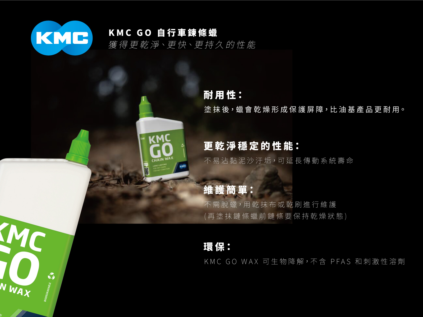 ﹡KMC為鏈條調製專屬的蠟液配方GO,幫助提升鏈條的耐用性以及順暢度。與傳統鏈條油相比,蠟鏈條不易沾附泥沙污垢,讓你輕鬆保養不弄髒雙手,還可以延長傳動系統壽命,幫你省荷包KMC GO只有純天然蠟材質,