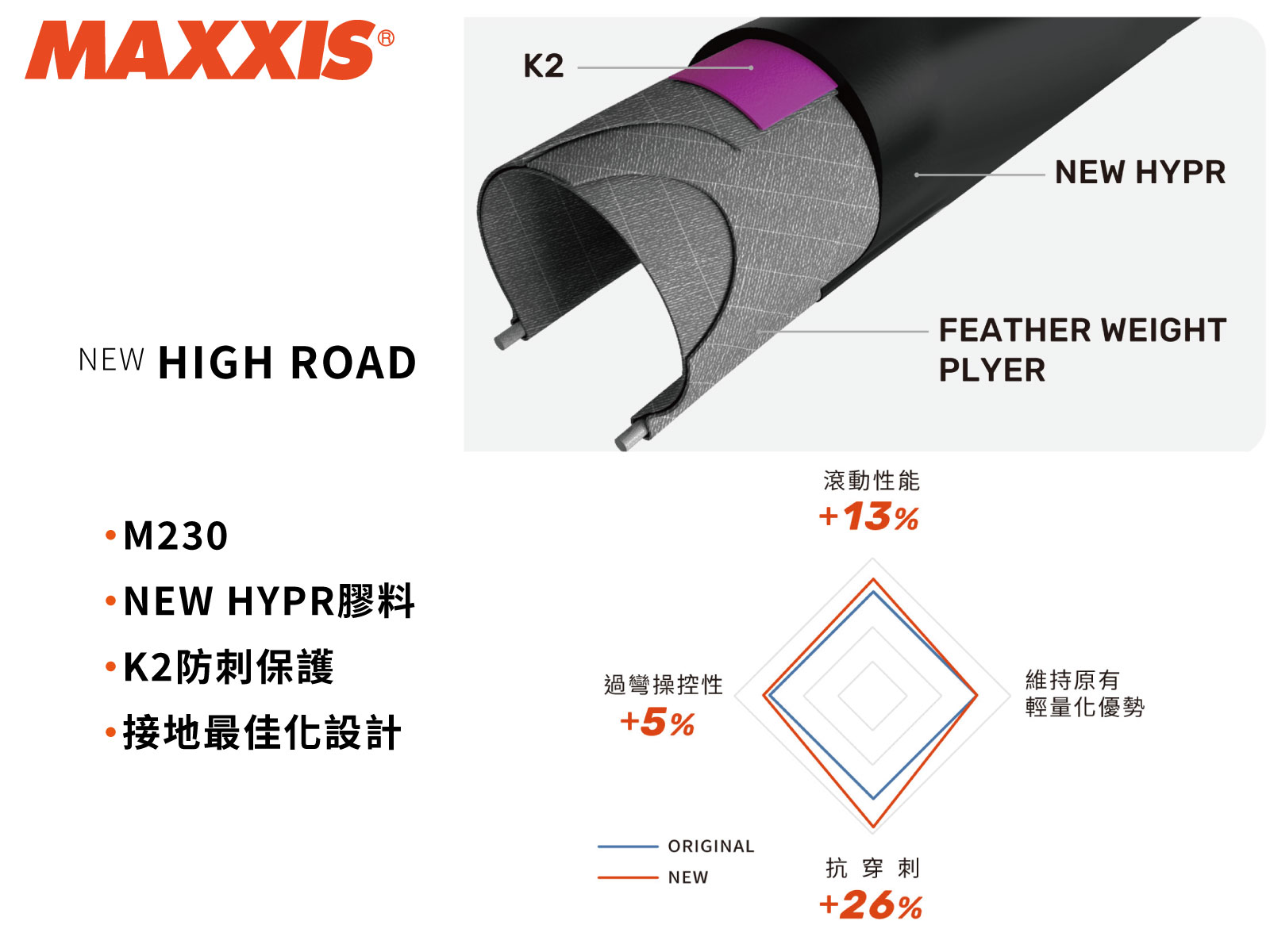 此款輪胎使用NEW HYPR超低滾阻膠料技術,同時相較上一代產品在防刺保護與過彎操控上再次提升,並維持輕量化設計,能帶給自行車騎士全新騎乘體驗 ﹡競賽級公路車胎